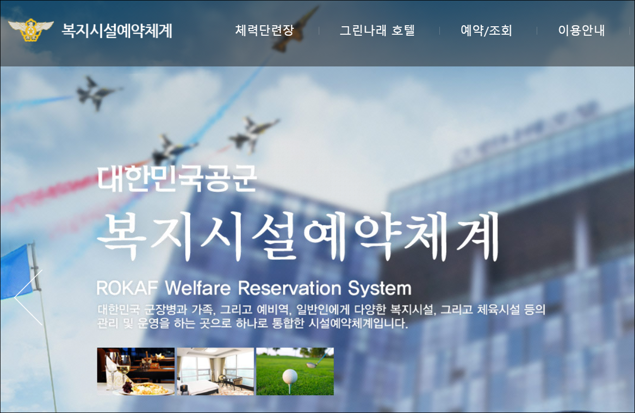 공군복지시설예약체계 홈페이지는 대한민국의 군장병과 가족, 예비역의 복지를 위해 체력단련장과 그린나래호텔을 이용할 수 있도록 제공하고 있는데요. 군장병 뿐 아니라 일반인들도 홈페이지에서 예약을 통해 체력단련장인 골프장을 이용할 수 있습니다.