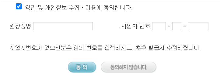 1. 홈페이지 접속 후 회원가입 버튼을 클릭한 후 원장성명과 사업자번호를 입력하여 회원가입을 완료하세요.