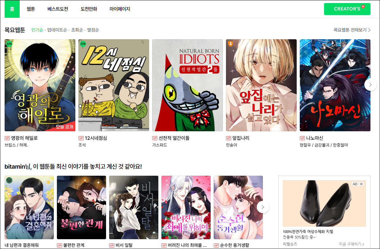 저도 naver 웹툰 자주 보는데 재밌는게 정말 많아요. 인기작은 왠만하면 다 본듯하네요. 아래 링크 클릭하면 NAVER 웹툰으로 바로 연결됩니다.