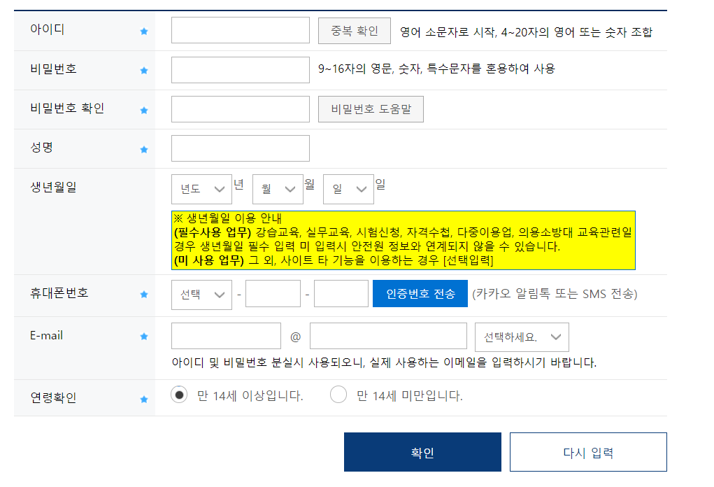 소방안전원 사이트는 안전원회원과 일반회원으로 가입 가능합니다. 홈페이지 이용시 본인인증을 통한 회원가입이 완료되어야 합니다.