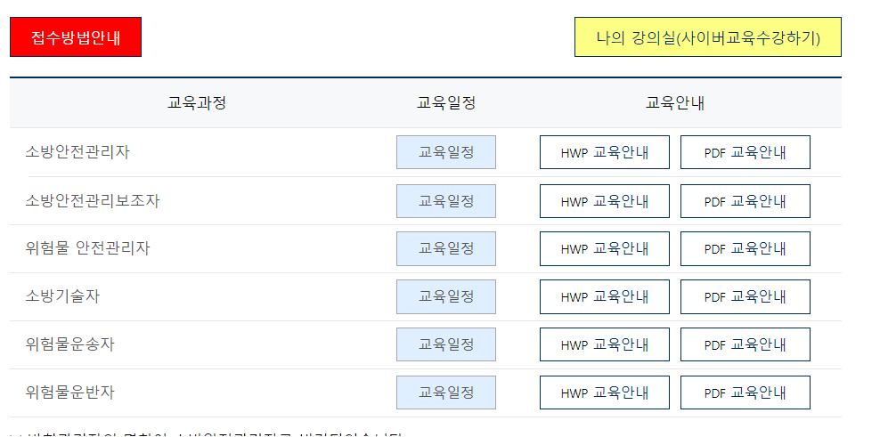 한국소방안전원 사이버교육센터 소방안전교육과 다중이용업 교육등을 제공하며 소방자격 취득관련 정보를 제공하는 사이트입니다. 홈페이지 주소는 다음과 같습니다.