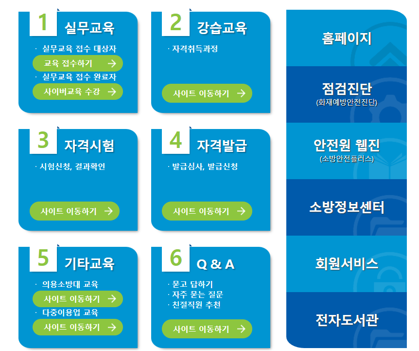 한국소방안전원 사이버교육센터 소방안전교육과 다중이용업 교육등을 제공하며 소방자격 취득관련 정보를 제공하는 사이트입니다. 홈페이지 주소는 다음과 같습니다.