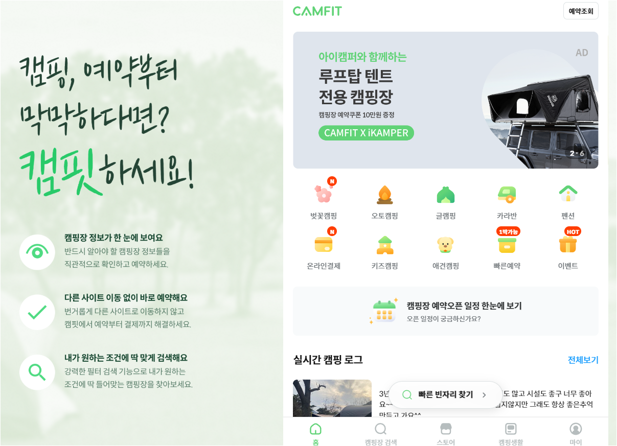 캠핏을 이용하기 위해서는 홈페이지에서 회원가입 후 이용가능합니다. 회원가입 및 예약 방법은 다음과 같습니다.