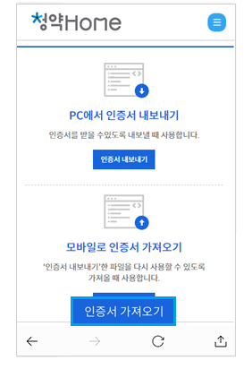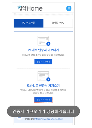 청약홈(pc) 홈페이지 접속 > 공동인증서 관리 메뉴 > PC → 모바일 > 모바일로 인증서 가져오기 선택 후 로그인