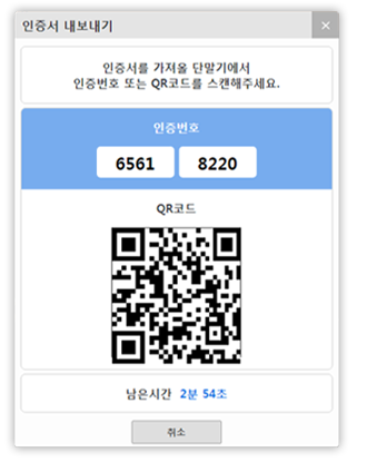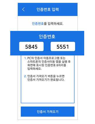 6. PC에서 발급받은 인증번호 8자리를 입력하신 후 [인증서 가져오기]버튼을 클릭하세요.