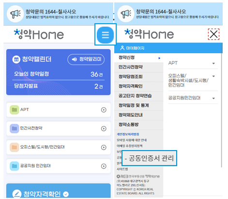 4. 모바일 청약홈 어플에 접속하신 후 메뉴를 선택하신 후 공동인증서 관리를 선택하세요.