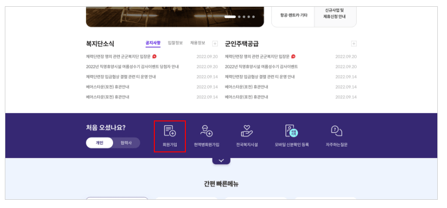 1. 국군복지포털 홈페이지 접속 후 홈페이지 하단의 회원가입 버튼 클릭하기