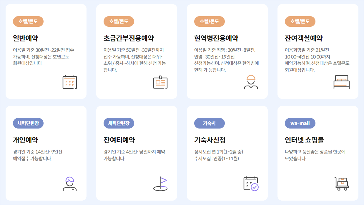 이용할 수 있는 서비스는 호텔/콘도/컨벤션, 체력단련장, 기숙사, 마트, 쇼핑타운 와몰등이 있습니다. 특히 와몰은 군장병을 위해 저렴하게 물건을 판매하는 온라인쇼핑몰로 회원가입 후 이용가능합니다.