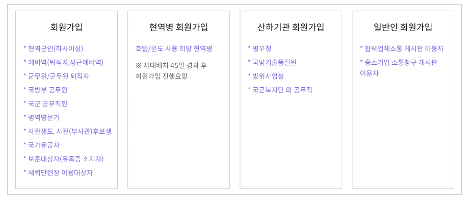단, 체력단련장은 회원가입 후 구비서류를 지참하여 내장시 제출하여 별도 승인을 받아야 합니다. 회원가입 자격은 현역, 예비역, 군무원, 국방부공무원, 국군 공무직원, 병역명문가, 사관생도,사관(부사관)후보생, 국가유공자, 국가보훈대상자(유족증 소지자), 체력단련장 이용대상자입니다.