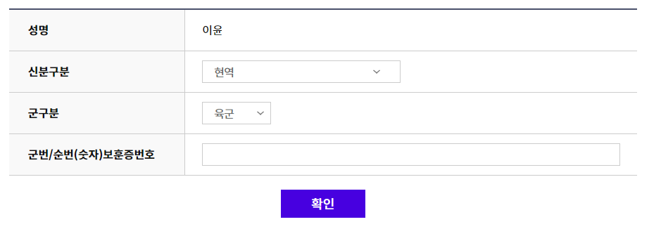 4. 신분구분, 군구분, 군번등 입력한 후 확인버튼 클릭하기