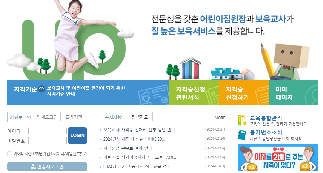 보육교직원 국가 자격증 홈페이지는 보육교사들의 자격증을 발급하고 구인구직정보를 제공하는 사이트입니다. 홈페이지 주소는 다음과 같습니다.