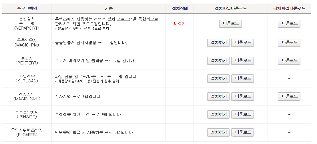 또한 납세자개인정보 보호를 위해 보안프로그램을 설치해야 하는데요. 설치할 프로그램 목록은 다음과 같습니다.