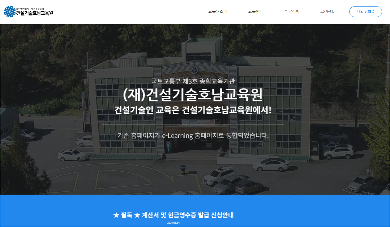 건설기술 호남교육원 이러닝센터는 국토교통부 산하교육기관으로 설계 및 시공등의 건설기술자를 위한 교육을 제공하고 있습니다. 홈페이지 주소는 다음과 같습니다.