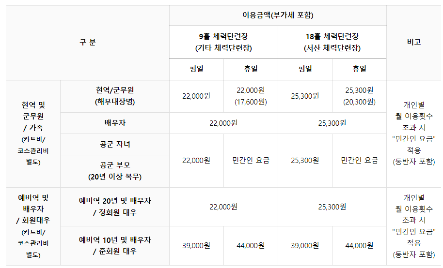 김해 체력단련장은 9홀로 이루어져 있으며 정회원 및 준회원 이용요금은 평일 및 주말 22,000원입니다. 민간인 이용요금은 평일72,000원, 민간인의날 61,000원, 휴일 88,000원입니다.
