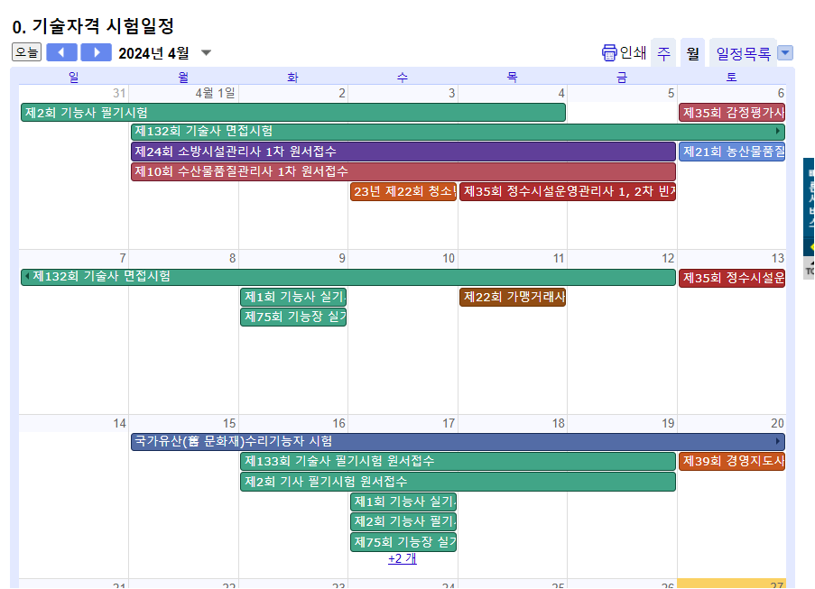 큐넷에서는 아래와 같이 캘린더를 통해 편리하게 시험일정을 확인가능합니다. 원서접수 시간은 시험일정의 첫날 오전 10시부터 마지막날의 오후 6시까지 가능합니다.