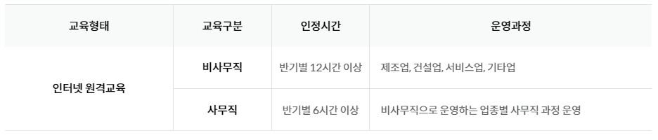 법에 따라 근로자들에게는 일정한 교육시간이 요구됩니다. 사무직 근로자의 경우 반기별 6시간 이상, 비사무직 근로자의 경우 반기별 12시간 이상의 교육을 받아야 합니다.