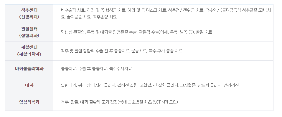 보강 병원은 다양한 진료과를 보유하고 있는데요. 척추센터에서는 신경외과적 치료부터 골다공증, 척추종양까지 다양한 척추 질환을 치료합니다. 이어서 관절센터는 퇴행성 관절염부터 관절경 수술까지 다양한 관절 질환을 다루고 있습니다. 재활센터는 수술 전후의 통증 치료와 운동치료를 통해 환자의 회복을 돕습니다. 마취통증의학과에서는 특수주사치료를 포함한 다양한 통증 치료를 제공합니다. 내과에서는 다양한 질환에 대한 치료와 건강검진을 실시하고 있으며, 영상의학과는 최신의 MRI를 활용하여 척추와 관절 질환의 조기 검진을 진행합니다. 병원을 방문하실 때는 해당 진료과로 직접 문의하시기 바랍니다.