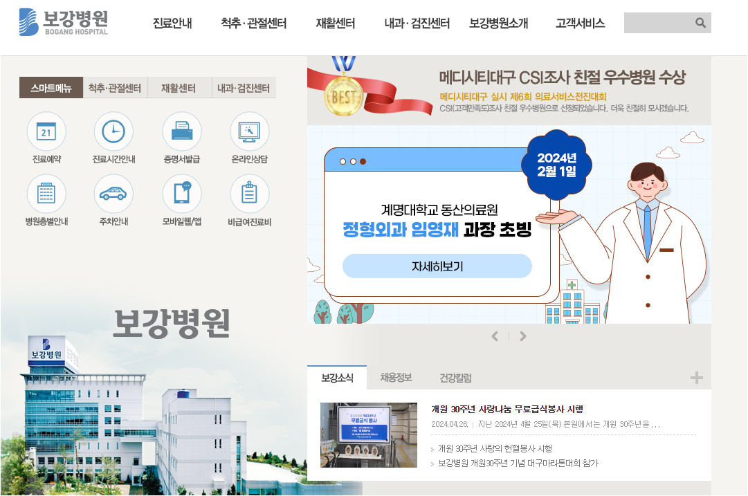 대구 보강병원은 1994년 개원하였으며 대전 달서구 월배로에 위치하고 있는데요. 척추전문병원으로 유명하며 신경외과, 정형외과, 마취통증학과, 내과, 재활의학과, 영상의학과 등이 있습니다. 보강병원 홈페이지 주소는 다음과 같습니다.