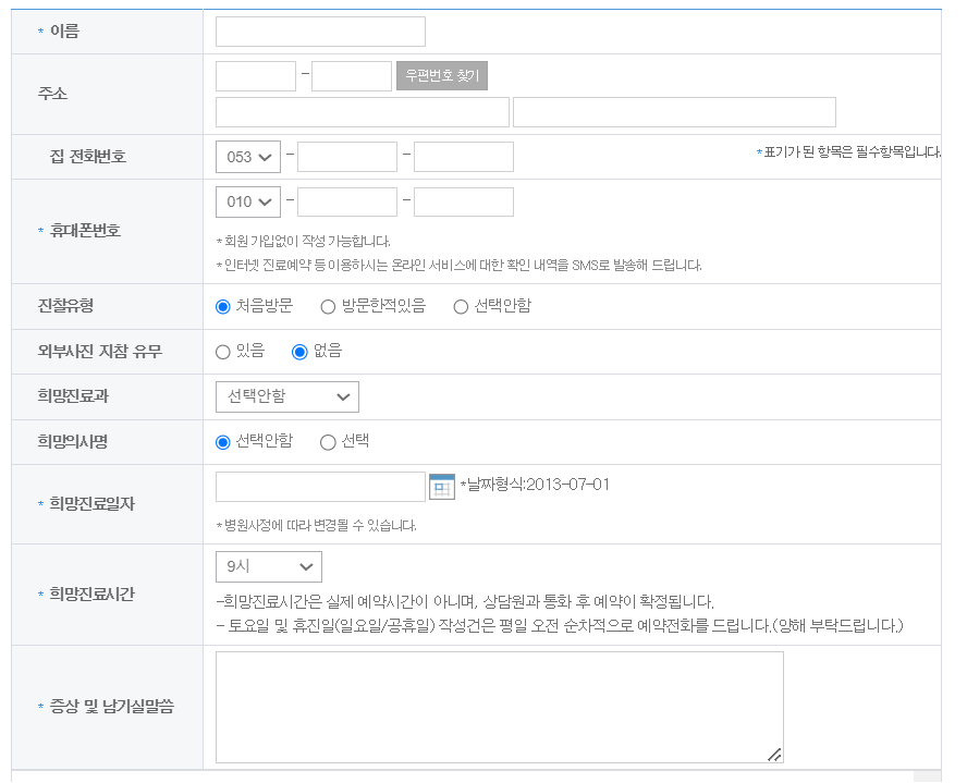 홈페이지를 통해 진료예약을 하실때는 메인화면 > 진료예약으로 접속하신 후 이름, 주소, 전화번호, 희망진료과, 진료일자, 의사, 진료시간등을 입력하신 후 진료예약을 신청하시면 됩니다.