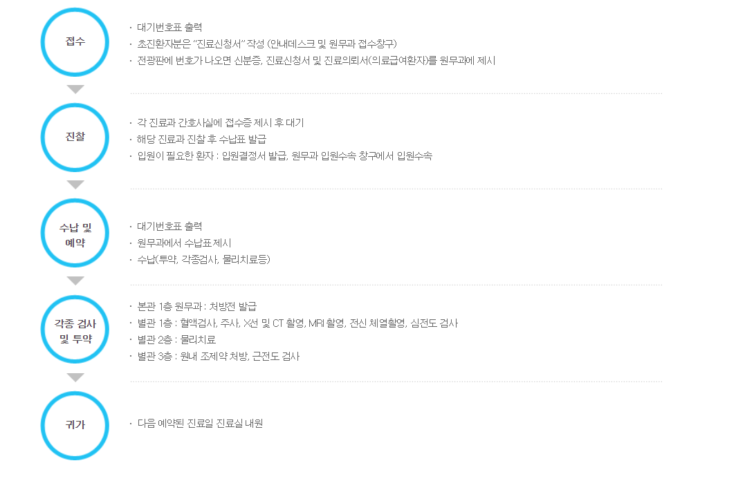 병원에 가셔서 진료를 보실때는 일련의 절차를 거치셔야 하는데요. 먼저 대기번호표를 출력하고, 초진환자분은 진료신청서를 작성하셔야 합니다. 그 후 전광판에 나오는 번호에 따라 신분증과 진료신청서를 원무과에 제시하시면 됩니다. 진찰을 받으실 때에는 해당 진료과의 간호사실에 접수증을 제시하고 대기하시면 진료 후 수납표가 발급됩니다. 입원이 필요한 경우에는 입원결정서를 받고 입원수속을 진행하셔야 합니다.
