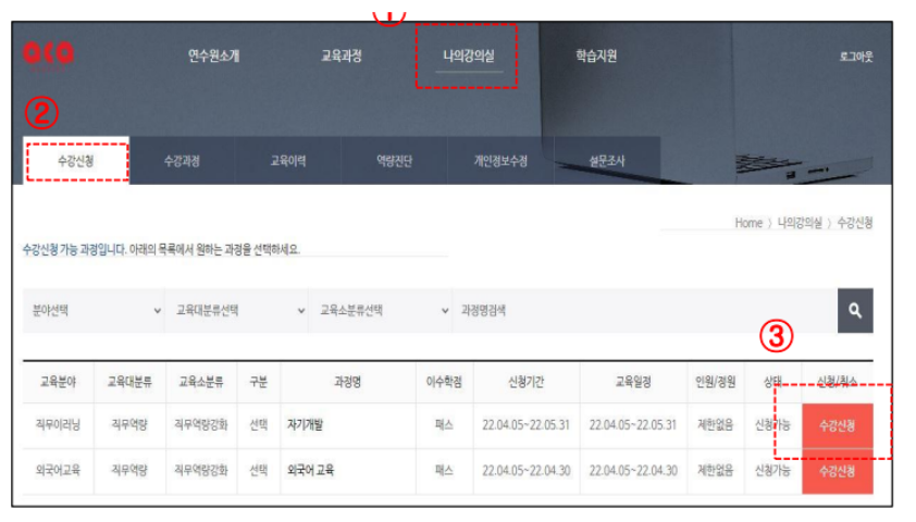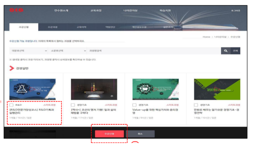 '수강신청' 페이지로 이동한 후, 원하는 강의를 선택합니다. 이때, 수강하고 싶은 강의를 체크한 뒤 '수강신청' 버튼을 클릭하여 신청을 완료합니다. 신청한 강의는 '나의 강의실'의 '수강과정'에서 확인할 수 있으며, 여기에서 학습을 진행할 수 있습니다.