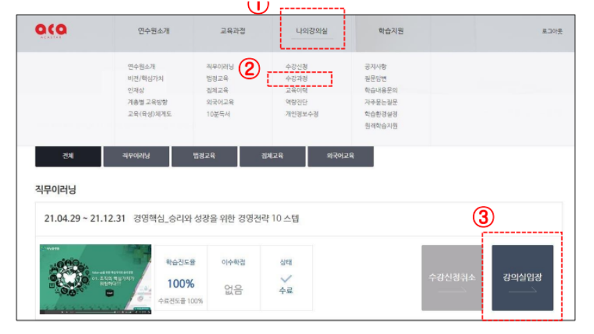강의실에 입장하여 학습을 진행하는 방법은 먼저, 학습 플랫폼에 로그인한 후 '나의 강의실'을 클릭합니다. 여기에서 본인이 등록한 강의를 한눈에 확인할 수 있습니다. 그 다음, 수강 중인 과정을 클릭하여 해당 과정의 상세 페이지로 이동합니다. 이 페이지에서 '강의실 입장' 버튼을 눌러 실제 강의실로 들어갑니다.