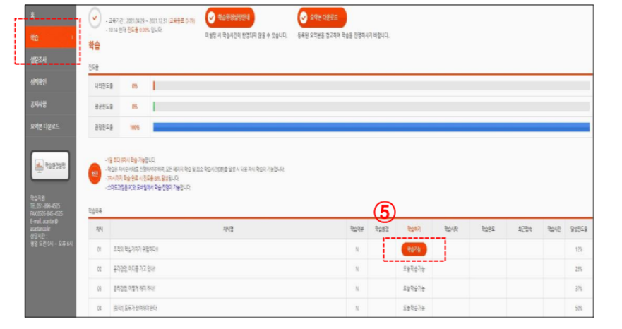 강의실에 입장하면 화면 왼쪽에 여러 메뉴가 보입니다. 이 중에서 '학습' 메뉴를 클릭합니다. 그러면 학습에 필요한 다양한 자료와 정보를 볼 수 있습니다. 마지막으로, '학습' 메뉴에서 '학습하기' 섹션을 찾아 '학습 가능' 버튼을 클릭하면 강의를 시작하거나 이어서 진행할 수 있습니다.