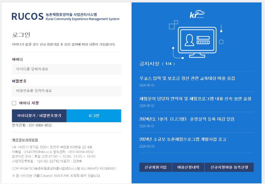 RUCOS 농촌체험휴양마을 사업관리시스템은 농촌의 체험마을을 운영하고 싶은 분들을 관리하기 위한 시스템인데요. 홈페이지 주소는 다음과 같습니다.
