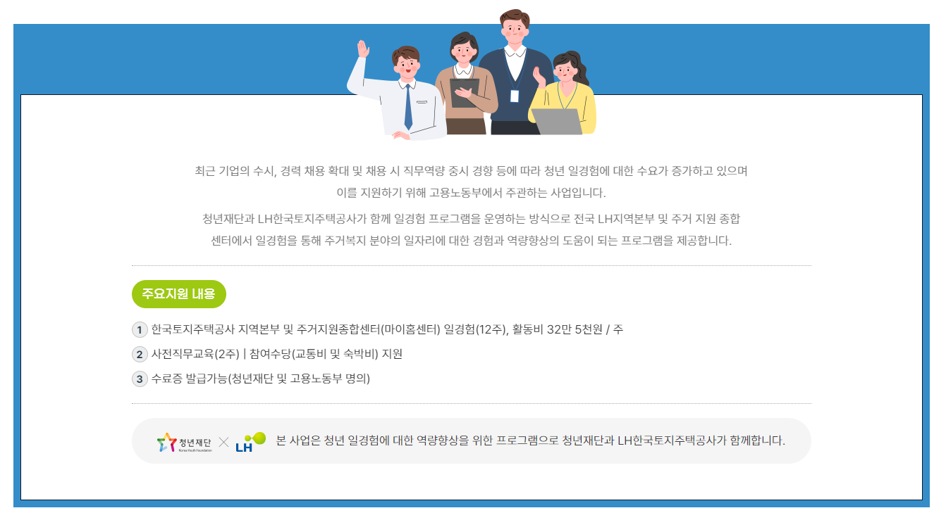 청년재단 미래내일일경험사업은 청년들이 일경험을 할 수 있도록 정부에서 지원하는 사업인데요. 12주 프로그램으로 활동비 32만 5천원을 주급으로 지급합니다. 또한 직무교육 2주 프로그램 참여시 교통비와 숙박비를 지원해주고, 수료증도 발급해주므로 여러가지로 취업에 도움되는 프로그램입니다.