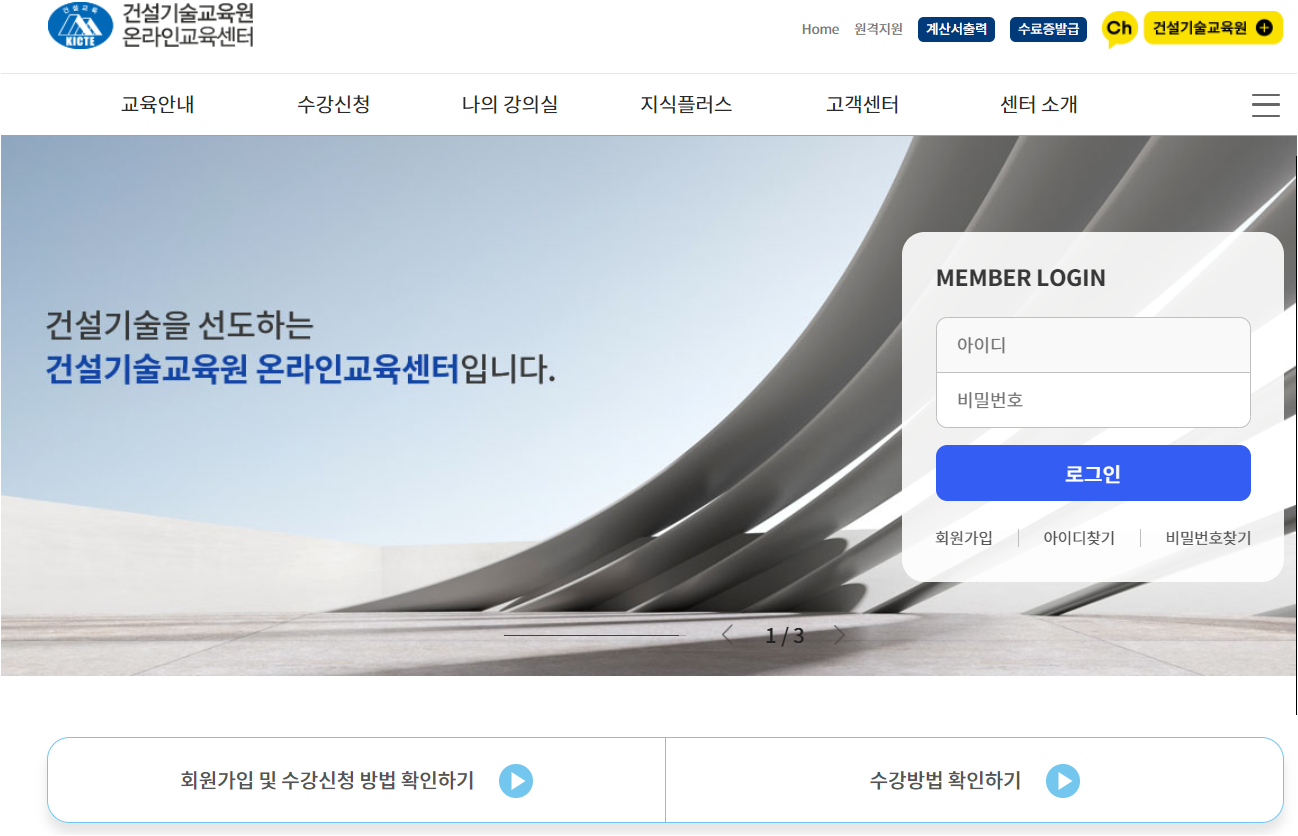 건설기술교육원 온라인 교육센터는 설계시공인, 건설사업관리기술인, 품질관리기술인등을 위한 온라인강의와 집체교육을 제공하고 있는데요. 건설기술인은 건설기술진흥법등에 의거하여 반드시 업무전 기본교육과 전문교육을 이수해야 하며 미이수시 과태료 50만원이 부과됩니다. 교육센터 홈페이지 주소는 다음과 같습니다.
