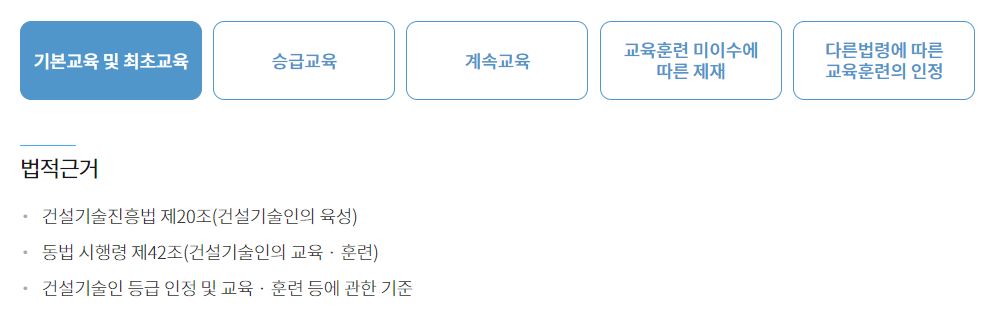 교육원에서는 설계·시공 건설기술인, 건설사업관리 건설기술인, 품질관리 건설기술인을 위한 교육을 제공하고 있는데요. 건설기술진흥법 제20조등에 의거하여 건설기술인은 기본교육과 전문교육을 이수해야 합니다.