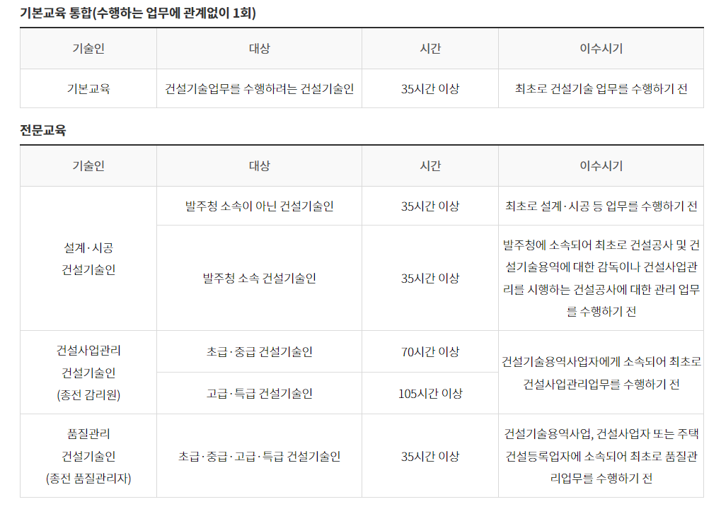 기본교육은 35시간이상을 이수해야 하며 건설기술 업무 수행전 반드시 이수해야 합니다. 전문교육은 기술인에 따라 35시간~105시간을 이수해야 하며 업무 수행전 반드시 해당 교육을 이수해야 합니다.