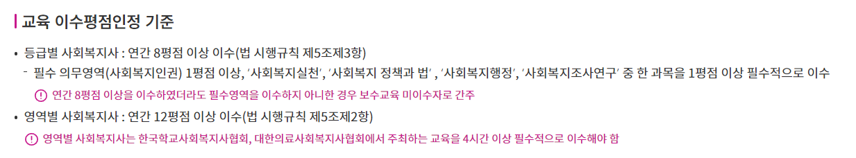 사회복지사는 사회복지사업법에 의하여 보수교육을 정기적으로 받아야 하는데요. 등급별 사회복지사는 연간 8평점이상 받아야 하며 영역별 사회복지사는 연간 12평점 이상 이수해야 합니다.