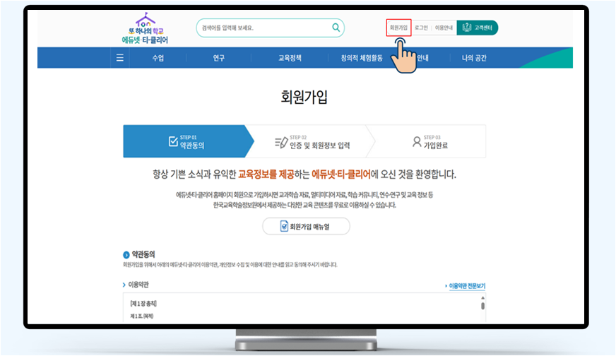 2. 회원가입 버튼을 클릭하여 에듀넷 홈페이지로 이동하세요. 핸드폰 본인인증 절차를 완료하시고 회원정보를 입력하면 가입이 완료됩니다.