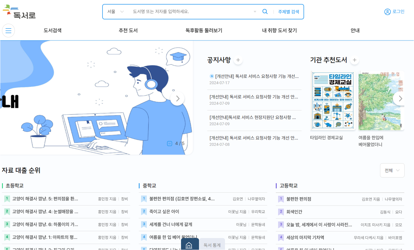 독서로는 학생들이 책을 일고 독서활동을 할 수 있도록 제공하는 온라인 독서지원 프로그램인데요. 독후활동과 도서정보, 독후활동지도등의 서비스를 제공합니다. 홈페이지 주소는 다음과 같습니다.