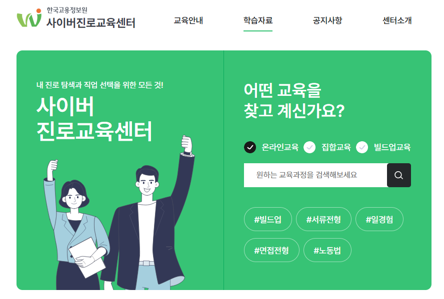 한국고용정보원 사이버진로교육센터는 진로 및 취업에 도움이 되는 교육을 무료로 제공하고 있는데요. 면접준비나 이력서 작성법, 노동법등 유용한 강의가 준비되어 있습니다. 홈페이지 바로가기는 다음과 같습니다.