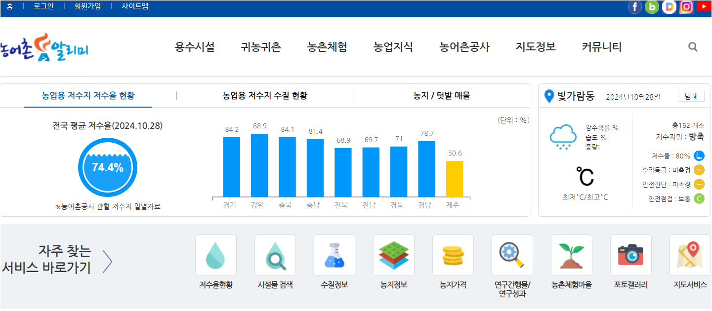 농어촌 알리미는 농어촌 정보포털사이트로서 농업용 저수지, 저수율, 수질, 빈집등의 정보를 제공하고 있는데요.