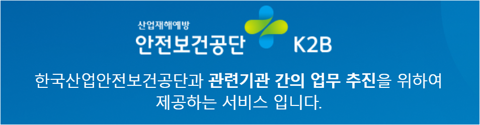 한국산업안전보건공단 K2B 홈페이지는 한국산업안전보건공단과 관련기관의 업무추진을 위한 업무를 제공하는 온라인 플랫폼입니다.