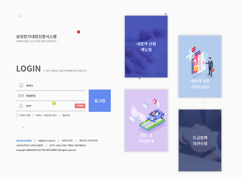 삼성전기 내방신청시스템은 보안을 강화하고 방문 절차를 효율적으로 관리하기 위해 마련된 시스템입니다. 방문을 계획하고 있다면, 사전에 내방신청시스템을 통해 간편하게 방문 예약을 진행하세요. 이를 통해 보다 원활하고 안전한 방문이 이루어질 수 있습니다.