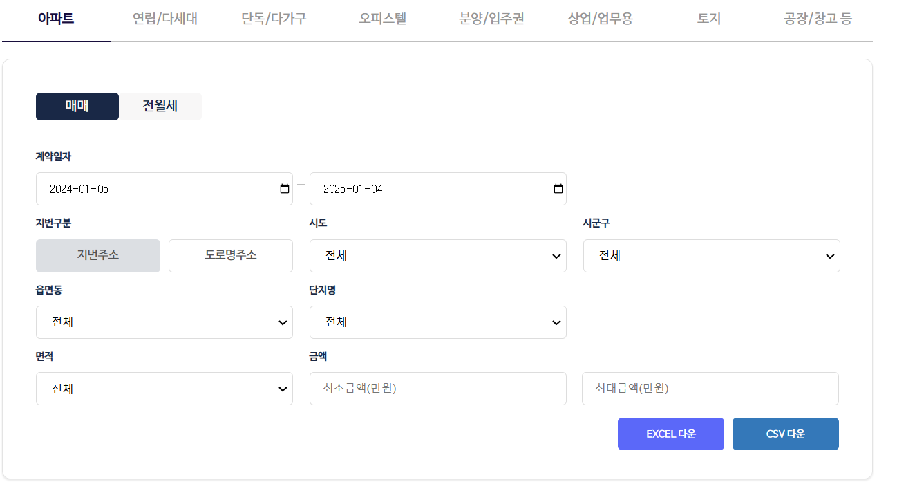 - 지역 선택: 화면 상단의 메뉴에서 아파트, 오피스텔, 연립주택 등의 부동산 유형을 선택한 후, 조회하고자 하는 지역을 선택합니다.