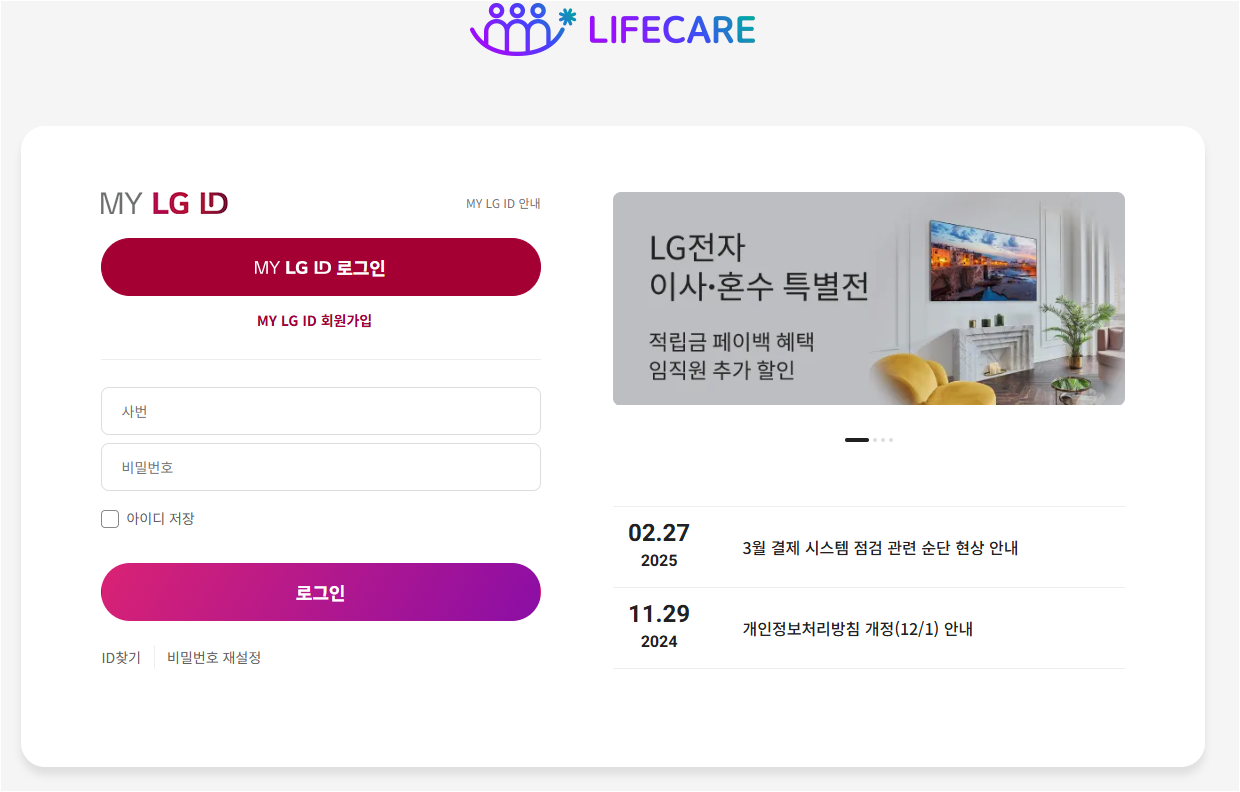 LG전자 임직원 복지몰은 LG전자 사내 계정을 통해 접근할 수 있습니다. 최초 로그인 시에는 사번과 기본 정보를 입력해 회원 가입을 완료해야 합니다.