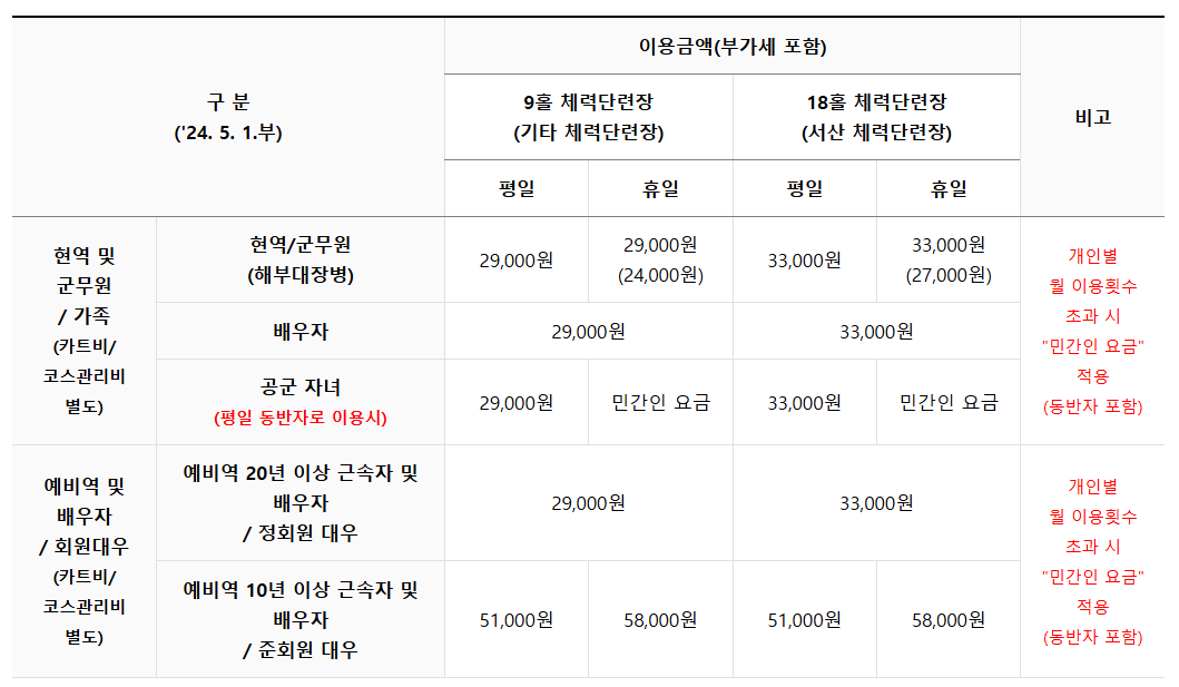 이용 요금은 회원 유형과 예약 시간대에 따라 다르며, 자세한 요금 안내는 공군복지시설예약체계 요금안내 페이지에서 확인 가능합니다.