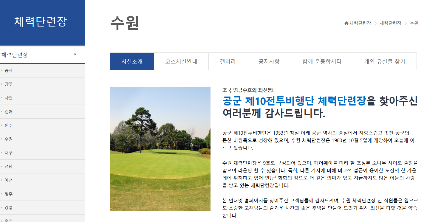수원 공군체력단련장은 수원시 권선구에 위치하는 군장병을 위한 골프장으로 일반인도 홈페이지를 통해 예약 후 이용가능합니다. 해당 사이트 바로가기는 다음과 같습니다.