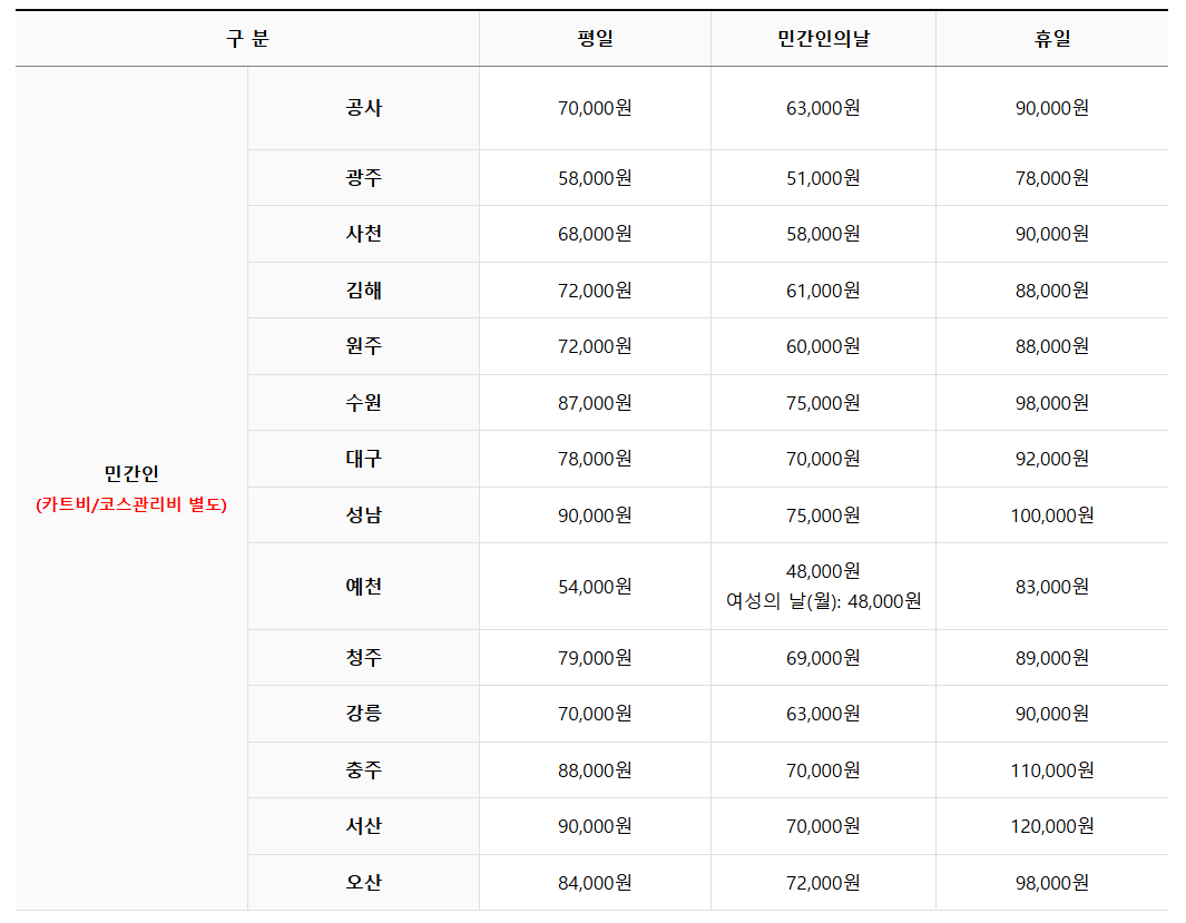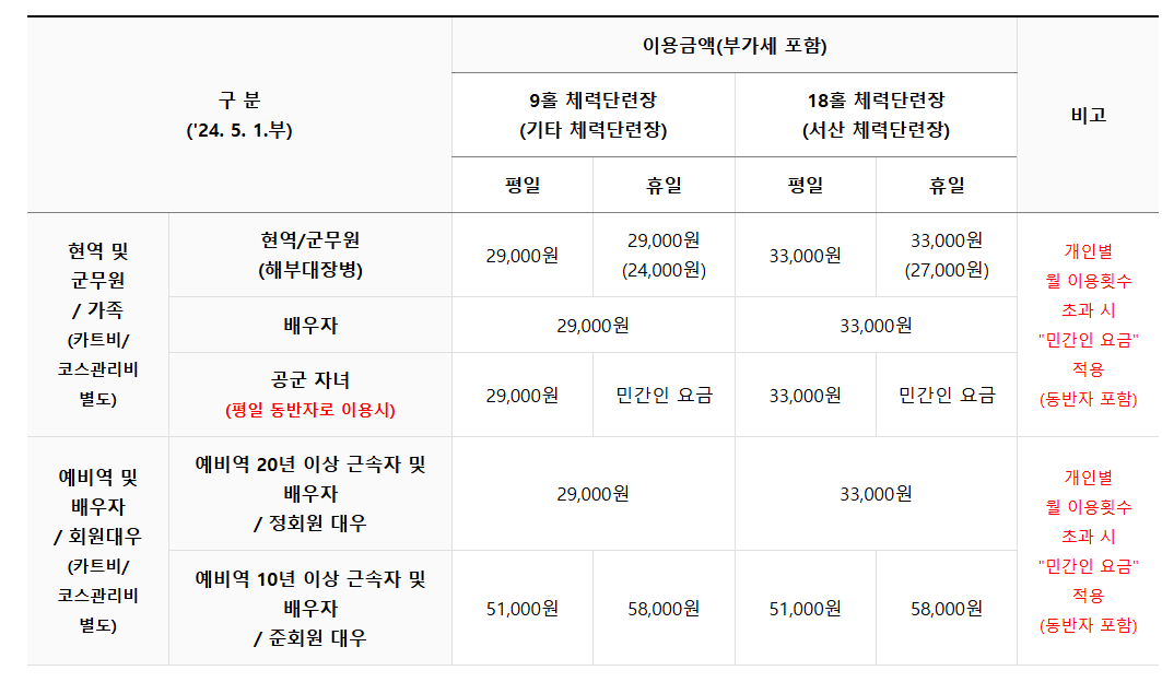이용 요금은 회원 유형과 예약 시간대에 따라 다르며, 자세한 요금 안내는 공군복지시설예약체계 요금안내 페이지에서 확인 가능합니다.