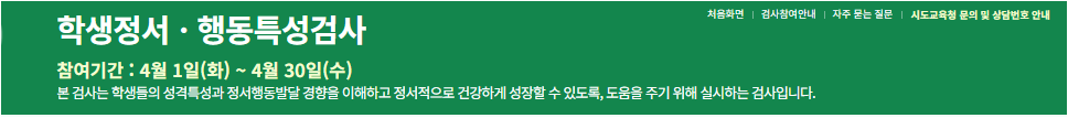 학생의 정서와 행동 특성을 이해하고, 필요한 지원을 제공하기 위해 매년 실시되는 학생정서·행동특성검사는 교육부 주관으로 전국 초·중·고등학교에서 시행됩니다. 홈페이지 주소는 다음과 같습니다.