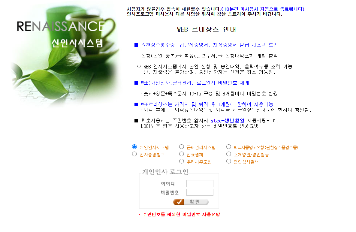 르네상스 신인사시스템은 에스텍시스템의 통합 인사관리 플랫폼으로, 직원들이 직접 로그인하여 다양한 인사 관련 업무를 처리할 수 있는 웹 기반 시스템입니다. 이를 통해 급여명세서 조회, 재직증명서 발급, 연말정산 자료 제출 등 다양한 기능을 손쉽게 이용할 수 있습니다.