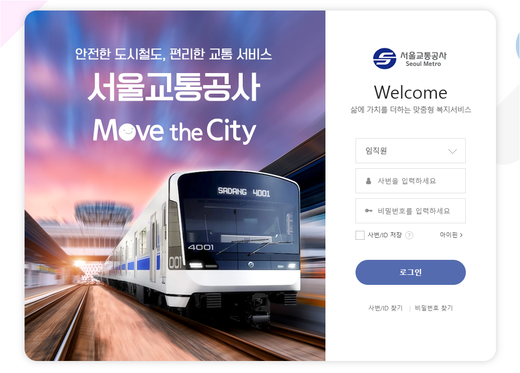 서울교통공사 복지 담당 부서로부터 지급받은 아이디와 초기 비밀번호를 사용하여 로그인합니다. 초기 비밀번호는 보안상 이유로 로그인 후 반드시 변경하는 것이 좋습니다. - 복지 포인트 확인 및 사용