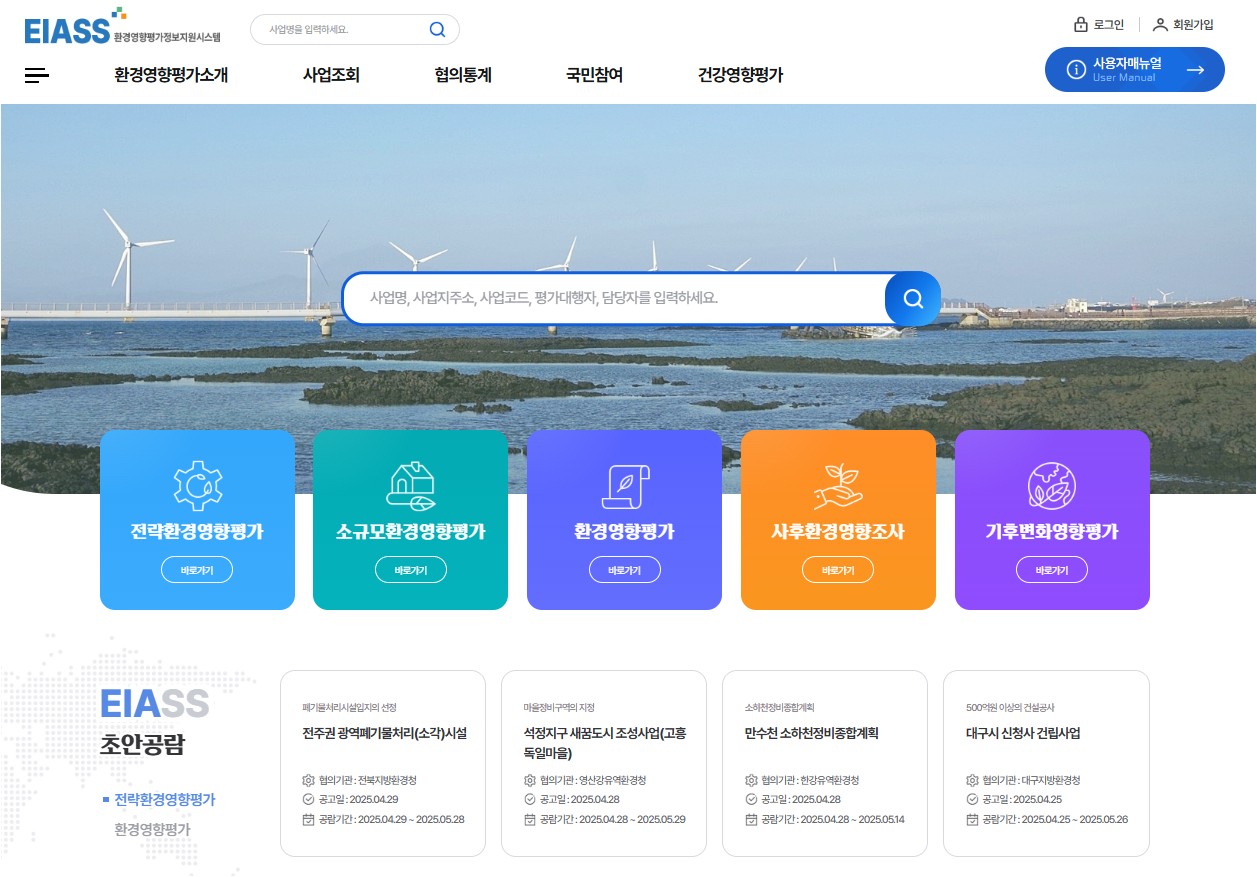 EIASS는 'Environmental Impact Assessment Support System'의 약자로, 환경영향평가와 관련된 다양한 정보를 제공하는 시스템입니다. 이 플랫폼은 전략환경영향평가, 소규모환경영향평가, 사전환경성검토, 사후환경영향조사 등 다양한 평가 유형의 정보를 통합하여 제공합니다.