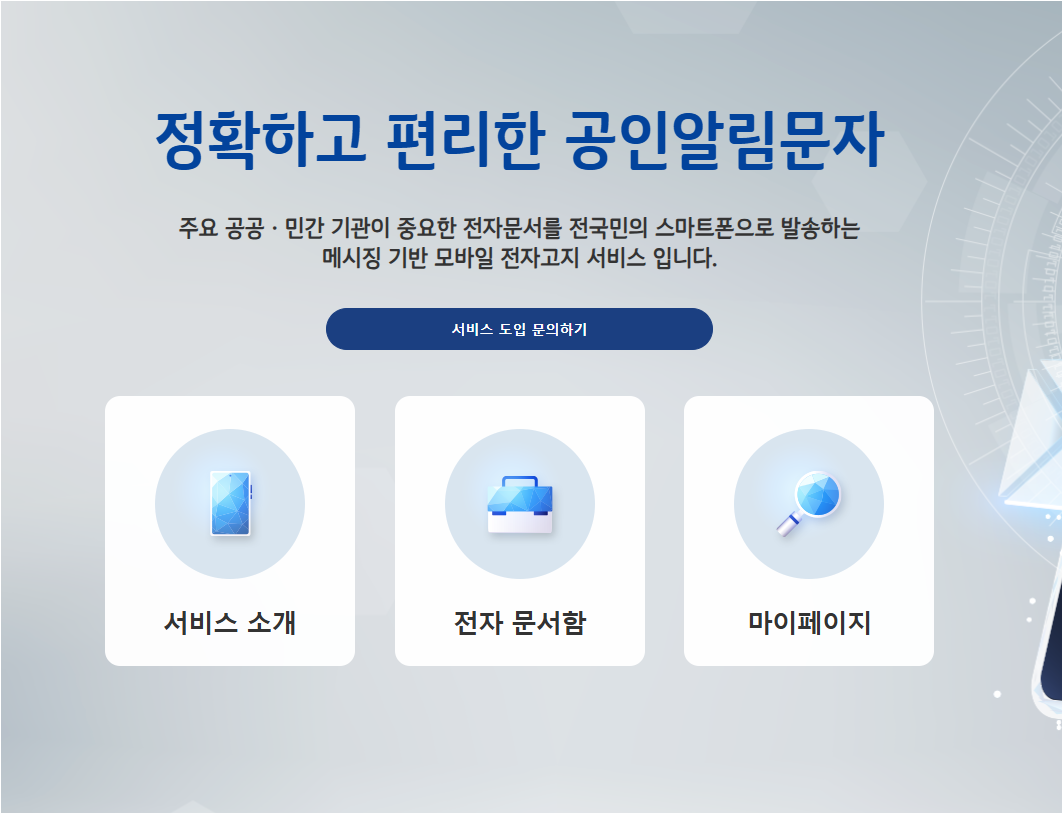 공인알림문자 서비스는 행정안전부와 과학기술정보통신부가 주관하고, 한국인터넷진흥원(KISA)이 운영하는 공공기관 전용 문자 발송 인증 시스템입니다. 이 시스템을 통해 국가기관, 지자체, 공공기관, 금융기관 등이 보낸 문자임을 국민이 쉽게 식별할 수 있도록 돕습니다.