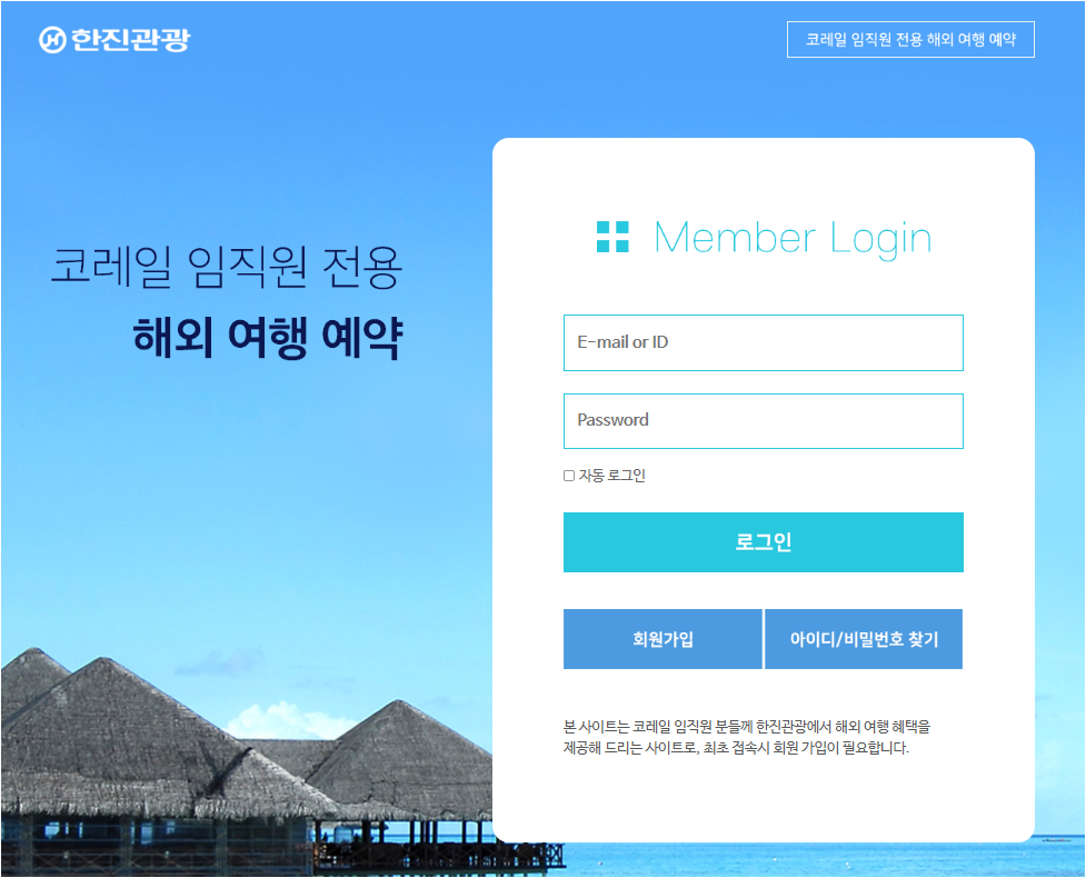 코레일 임직원 전용 해외 여행 예약 사이트는 코레일 임직원 분들이 한진관광을 통해 해외 여행 혜택을 받을 수 있도록 제공하는 사이트로 최초 접속시 회원 가입이 필요합니다. 해당 사이트 바로가기는 다음과 같습니다.